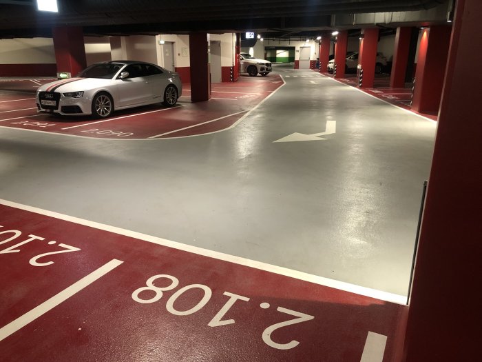 В многоуровневом подземном паркинге БЦ на бетонных полах с упрочнённым верхним слоем («топпингом») в течение периода эксплуатации образовались многочисленные выбоины, трещины и другие повреждения. Протечки воды сквозь перекрытия уровней паркинга повышали риск снижения несущей способности строительных конструкций. Для комплексного решения задач проекта заказчиком и производителем работ было согласовано устройство комбинированного защитного полимерного покрытия пола ПОЛИПЛАН® Вариант. Этот конструктив покрытия в течение долгих лет успешно эксплуатируется на многочисленных объектах в Москве и российских регионах.